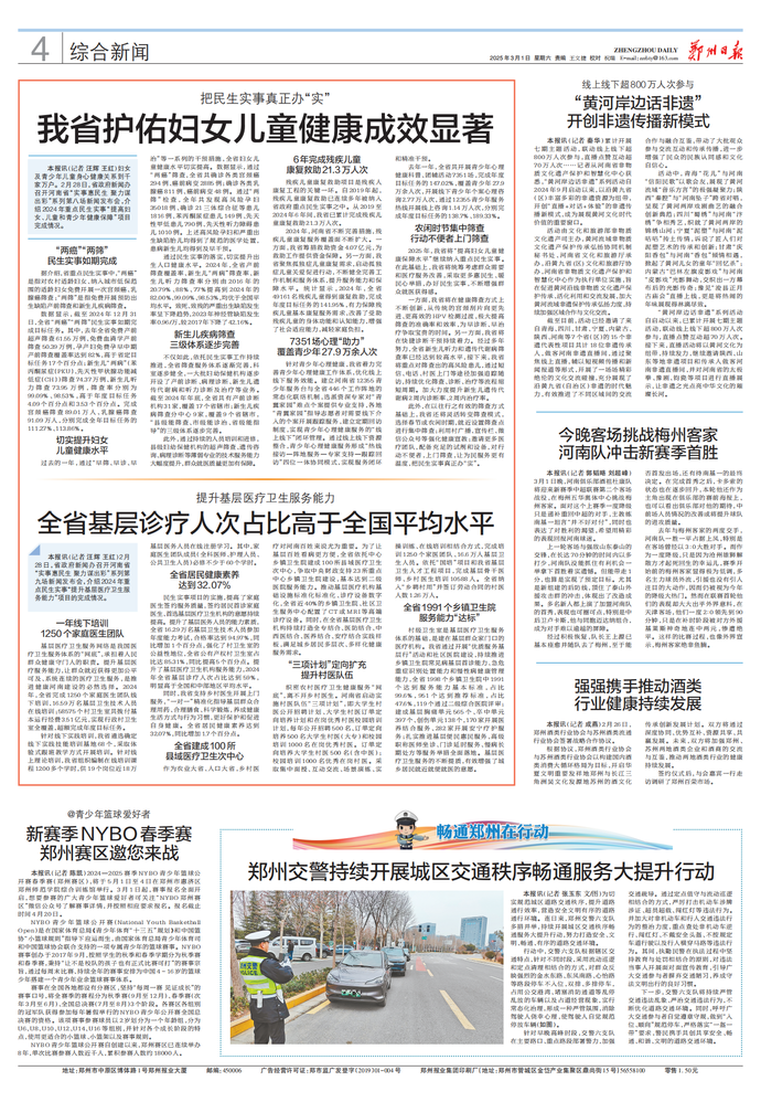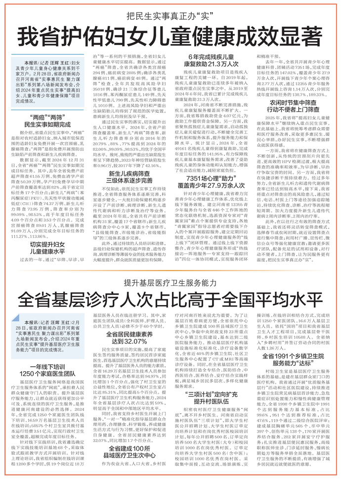 妇女及青少年儿童身心健康关系到千家万户。2月28日,省政府新闻办召开河南省“实事惠民生 聚力谋出彩”系列第八场新闻发布会,介绍2024年重点民生实事“提高妇女、儿童和青少年健康保障”项目完成情况。(今日《郑州日报》4版)
