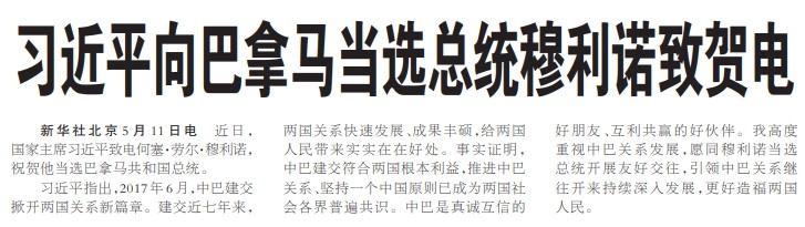 习近平向巴拿马当选总统穆利诺致贺电