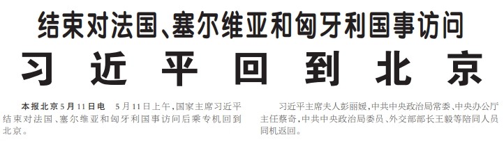 5月11日上午,国家主席习近平结束对法国、塞尔维亚和匈牙利国事访问后乘专机回到北京。