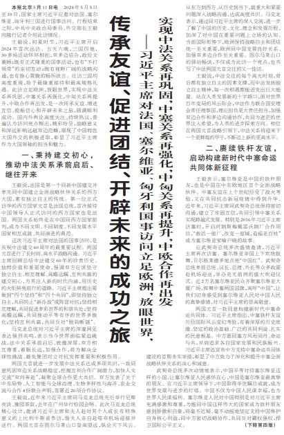 2024年5月5日至10日,国家主席习近平应邀对法国、塞尔维亚、匈牙利三国进行国事访问。行程结束之际,中共中央政治局委员、外交部长王毅向随行记者介绍此访情况。(今日《人民日报》1版、4版)