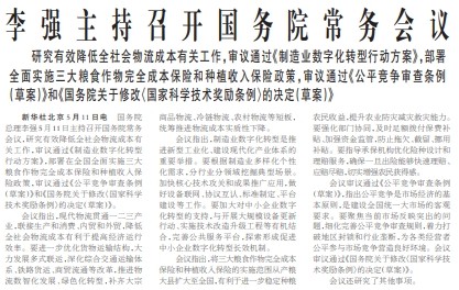 国务院总理李强5月11日主持召开国务院常务会议,研究有效降低全社会物流成本有关工作,审议通过《制造业数字化转型行动方案》,部署在全国全面实施三大粮食作物完全成本保险和种植收入保险政策,审议通过《公平竞争审查条例(草案)》和《国务院关于修改〈国家科学技术奖励条例〉的决定(草案)》。(今日《人民日报》1版)