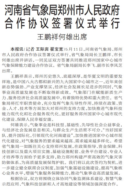 5月11日,河南省气象局、郑州市人民政府合作协议签署仪式举行,省气象局局长王鹏祥、市长何雄出席并讲话,一同见证双方签署共同推进郑州国家中心城市气象保障能力建设合作协议。省气象局副局长李飞、副市长李凤芝出席。(今日《郑州日报》1版)