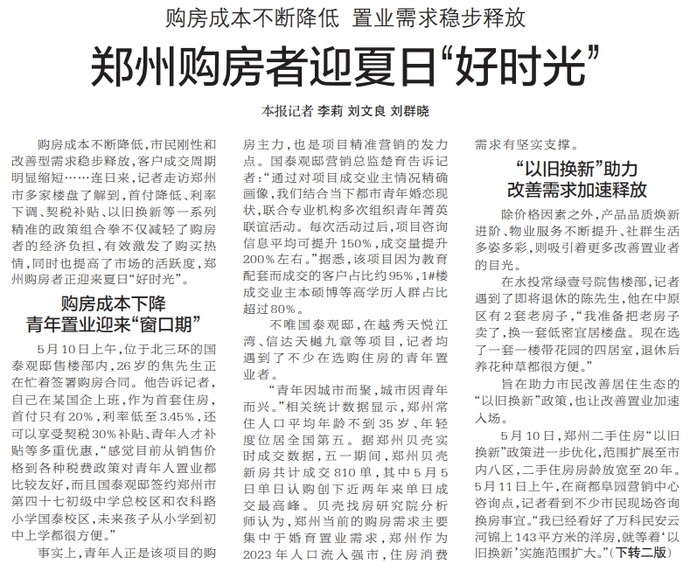 购房成本不断降低,市民刚性和改善型需求稳步释放,客户成交周期明显缩短……连日来,记者走访郑州市多家楼盘了解到,首付降低、利率下调、契税补贴、以旧换新等一系列精准的政策组合拳不仅减轻了购房者的经济负担,有效激发了购买热情,同时也提高了市场的活跃度,郑州购房者正迎来夏日“好时光”。(今日《郑州日报》1版、2版)