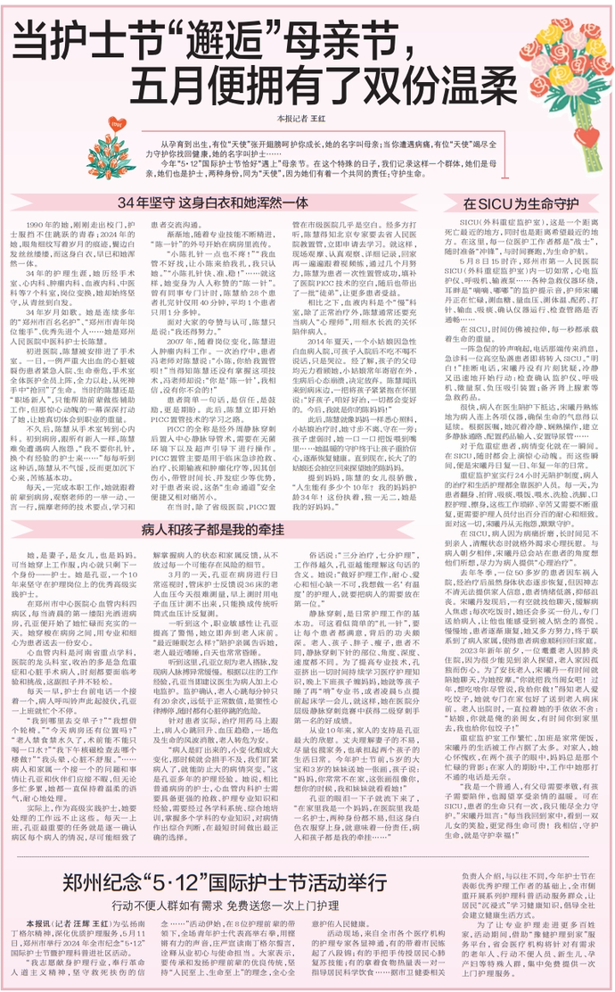 今年“5·12”国际护士节恰好“遇上”母亲节。在这个特殊的日子,我们记录这样一个群体,她们是母亲,她们也是护士,两种身份,同为“天使”,因为她们有着一个共同的责任:守护生命。(今日《郑州日报》2版)
