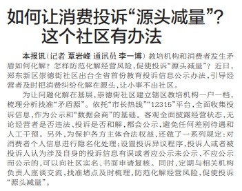 教培机构和消费者发生矛盾如何化解?怎样防范化解经营风险,促使投诉“源头减量”?近日,郑东新区崇德街社区出台全省首份教育投诉信息公示办法,引导经营者及时把消费纠纷化解在源头,让小事不出社区。(今日《郑州日报》2版)