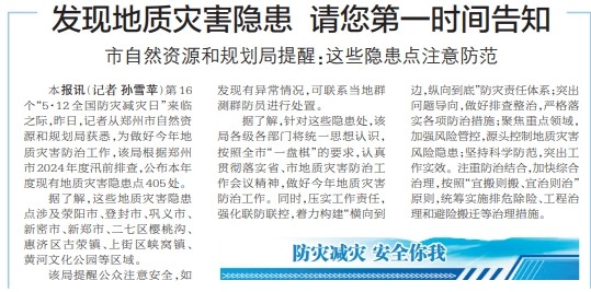 第16个“5·12全国防灾减灾日”来临之际,昨日,记者从郑州市自然资源和规划局获悉,为做好今年地质灾害防治工作,该局根据郑州市2024年度汛前排查,公布本年度现有地质灾害隐患点405处。