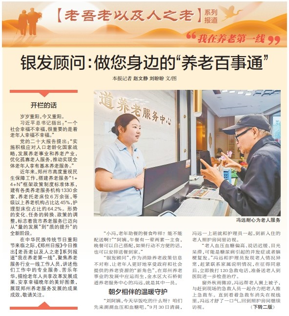 “银发顾问”,作为消除养老政策信息不对称、让老年人更好地享受政府和社会提供的养老资源的“新角色”,在郑州养老事业的发展中应运而生,金水区大石桥街道养老服务中心的冯远,就是其中一员。(今日《郑州日报》1版、2版)