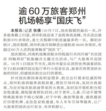 逾60万旅客郑州机场畅享“国庆飞”