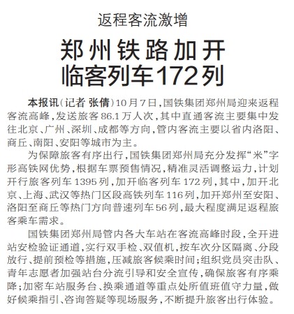 10月7日,国铁集团郑州局迎来返程客流高峰,发送旅客86.1万人次,其中直通客流主要集中发往北京、广州、深圳、成都等方向,管内客流主要以省内洛阳、商丘、南阳、安阳等城市为主。(今日《郑州日报》2版)