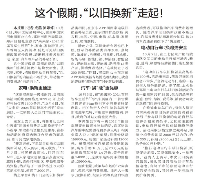 10月6日,郑州国际会展中心,在由中国家用电器商业协会、郑州市商务局指导,郑州日报社主办的“未来家·2024首届智享生活节”上,家电、家装厨卫、汽车等展区人流涌动,随处可见以旧换新政策宣传海报,清晰标注着各类家电、家居、汽车等产品的补贴折扣。(今日《郑州日报》2版)