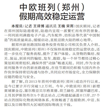 中欧班列(郑州) 假期高效稳定运营