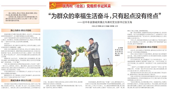 见到张玉海,他道出任中牟县狼城岗镇北韦滩村党支部书记以来的三点心得——用“三个真”答好强村富民的问卷。(今日《郑州日报》2版)