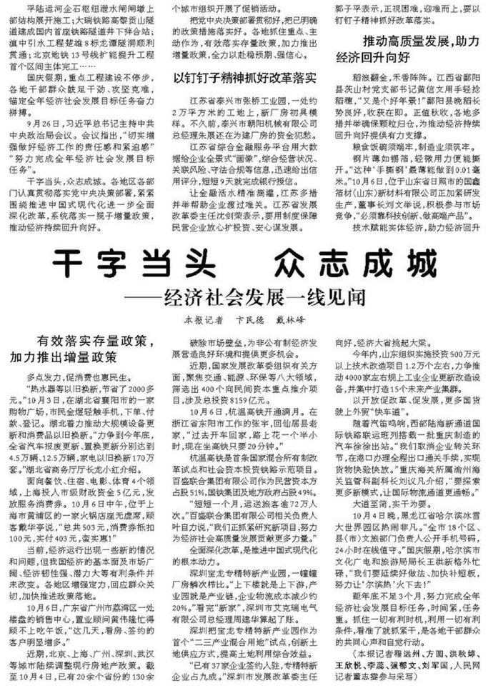 国庆假期,重点工程建设不停步,各地干部群众鼓足干劲、攻坚克难,锚定全年经济社会发展目标任务奋力拼搏。(今日《人民日报》1版)