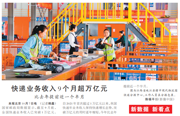 国家邮政局数据显示,截至9月底,全国快递业务收入已突破1万亿元。自2021年首次超过1万亿元以来,我国快递年业务收入保持快速增长态势,突破万亿元的用时逐年缩短,今年比去年提前近一个半月。(今日《人民日报》1版)