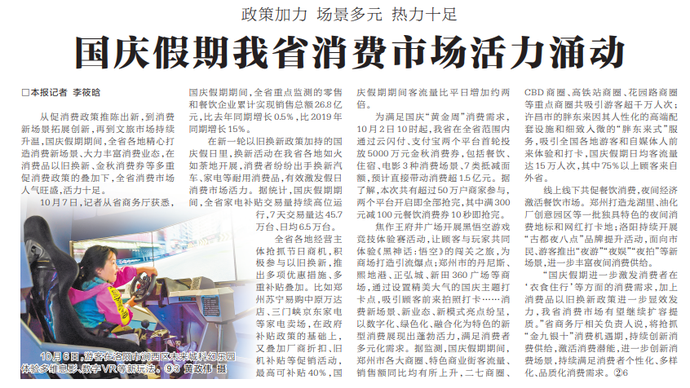 从促消费政策推陈出新,到消费新场景拓展创新,再到文旅市场持续升温,国庆假期期间,全省各地精心打造消费新场景、大力丰富消费业态,在消费品以旧换新、金秋消费券等多重促消费政策的叠加下,全省消费市场人气旺盛,活力十足。(今日《河南日报》2版)