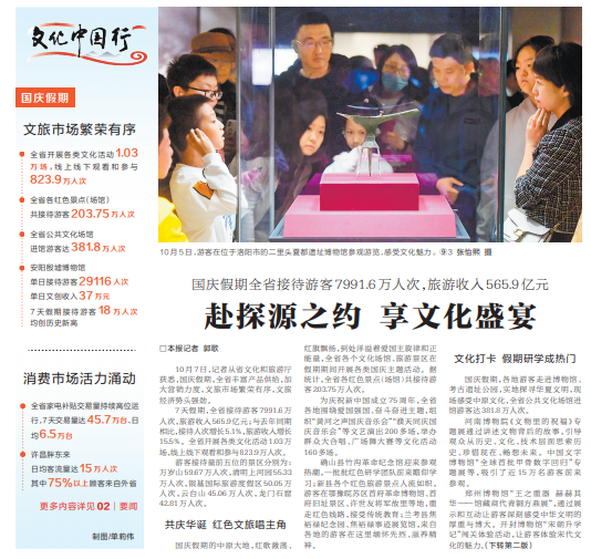 144小时过境免签全面实施,“文化游”带动文旅文创深度融合,考古工地开放日活动成为常态,精品剧场剧目不断更新……刚刚过去的国庆假期,郑州各大景区人山人海,文化街区热闹非凡,综合大数据监测、抽样调查和区县(市)统计,国庆假期全市接待游客1614.2万人次,郑州文旅在金秋十月交上了一份精彩答卷。(今日《郑州日报》1版、4版)