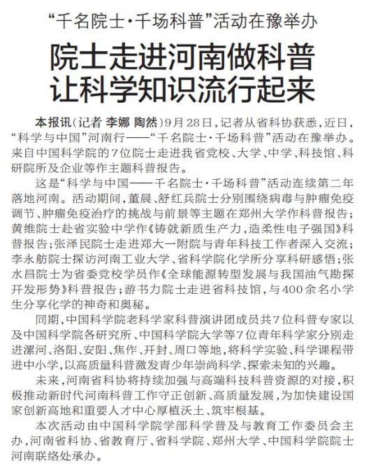 9月28日,记者从省科协获悉,近日,“科学与中国”河南行——“千名院士·千场科普”活动在豫举办。来自中国科学院的7位院士走进我省党校、大学、中学、科技馆、科研院所及企业等作主题科普报告。(今日《郑州日报》1版)