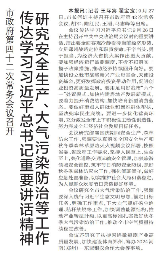 9月27日,市长何雄主持召开市政府第42次常务会议,胡军、陈红民、王滔、马志峰等出席。(今日《郑州日报》1版)