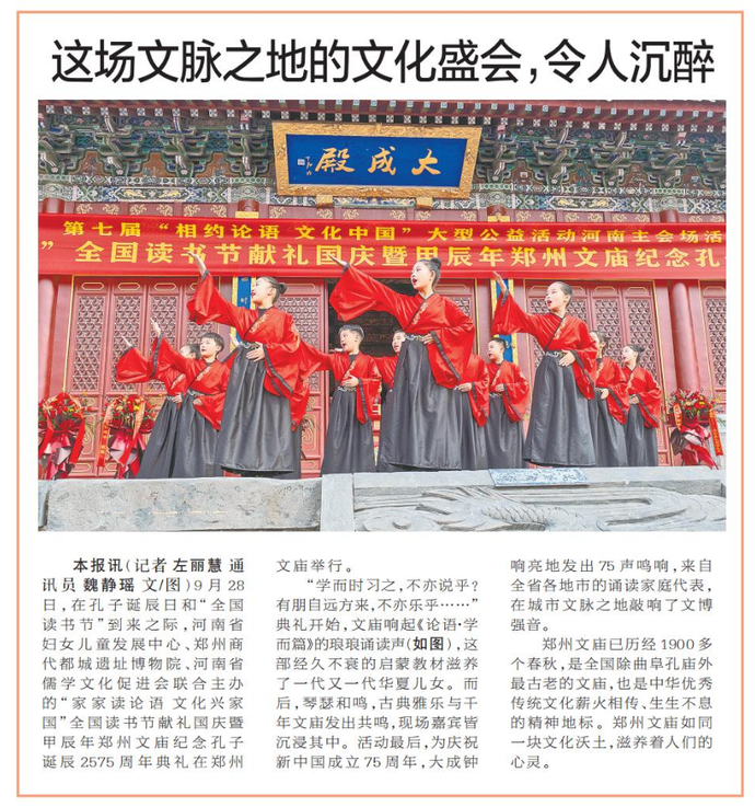 9月28日,在孔子诞辰日和“全国读书节”到来之际,河南省妇女儿童发展中心、郑州商代都城遗址博物院、河南省儒学文化促进会联合主办的“家家读论语 文化兴家国”全国读书节献礼国庆暨甲辰年郑州文庙纪念孔子诞辰2575周年典礼在郑州文庙举行。(今日《郑州日报》1版)