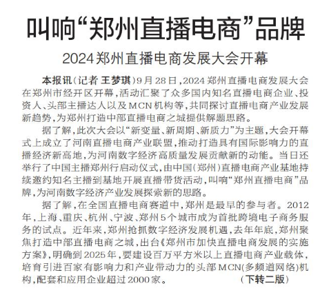 9月28日,2024郑州直播电商发展大会在郑州市经开区开幕,活动汇聚了众多国内知名直播电商企业、投资人、头部主播达人以及MCN机构等,共同探讨直播电商产业发展新趋势,为郑州打造中部直播电商之城提供解题思路。(今日《郑州日报》1版、2版)