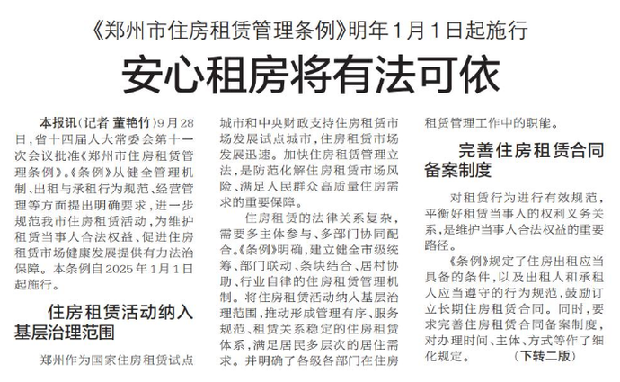 9月28日,省十四届人大常委会第十一次会议批准《郑州市住房租赁管理条例》。《条例》从健全管理机制、出租与承租行为规范、经营管理等方面提出明确要求,进一步规范我市住房租赁活动,为维护租赁当事人合法权益、促进住房租赁市场健康发展提供有力法治保障。本条例自2025年1月1日起施行。(今日《郑州日报》1版、2版)
