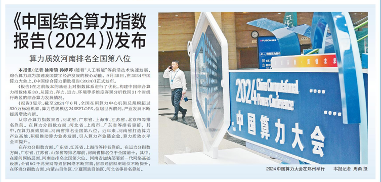 随着“人工智能”等前沿技术快速发展,综合算力成为加速我国数字经济发展的核心动能。9月28日,在2024中国算力大会上,《中国综合算力指数报告(2024)》正式发布。(今日《郑州日报》2版)