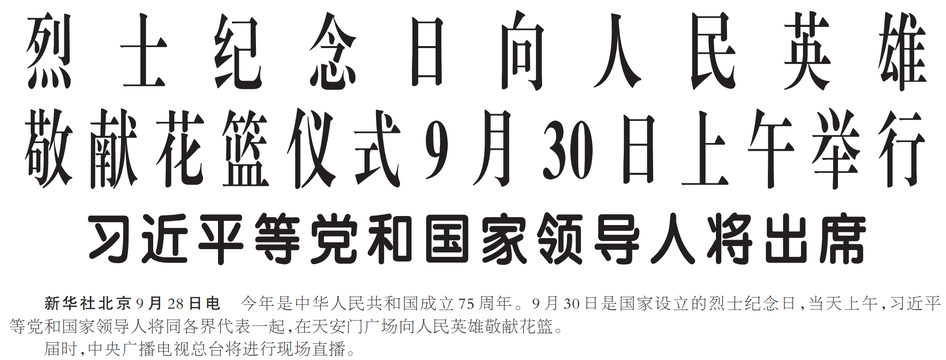 今年是中华人民共和国成立75周年。9月30日是国家设立的烈士纪念日,当天上午,习近平等党和国家领导人将同各界代表一起,在天安门广场向人民英雄敬献花篮。(今日《人民日报》1版)