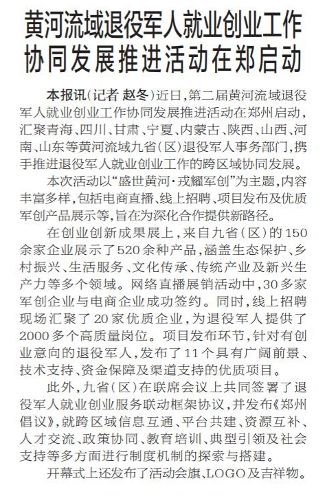 近日,第二届黄河流域退役军人就业创业工作协同发展推进活动在郑州启动,汇聚青海、四川、甘肃、宁夏、内蒙古、陕西、山西、河南、山东等黄河流域九省(区)退役军人事务部门,携手推进退役军人就业创业工作的跨区域协同发展。(今日《郑州日报》2版)
