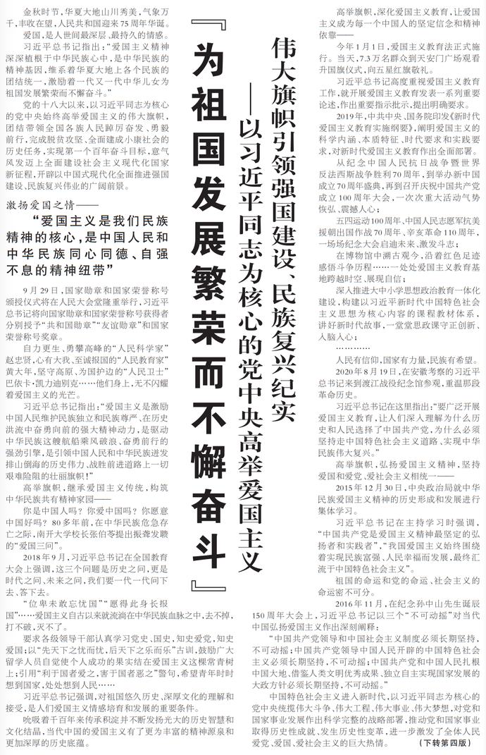 习近平总书记指出:“爱国主义精神深深植根于中华民族心中,是中华民族的精神基因,维系着华夏大地上各个民族的团结统一,激励着一代又一代中华儿女为祖国发展繁荣而不懈奋斗。”(今日《人民日报》1版、4版)