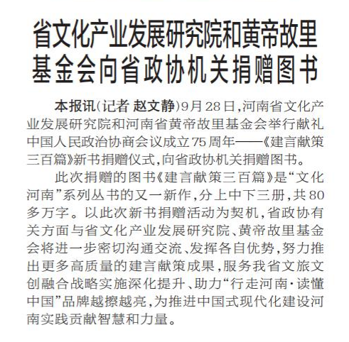 9月28日,河南省文化产业发展研究院和河南省黄帝故里基金会举行献礼中国人民政治协商会议成立75周年——《建言献策三百篇》新书捐赠仪式,向省政协机关捐赠图书。(今日《郑州日报》2版)