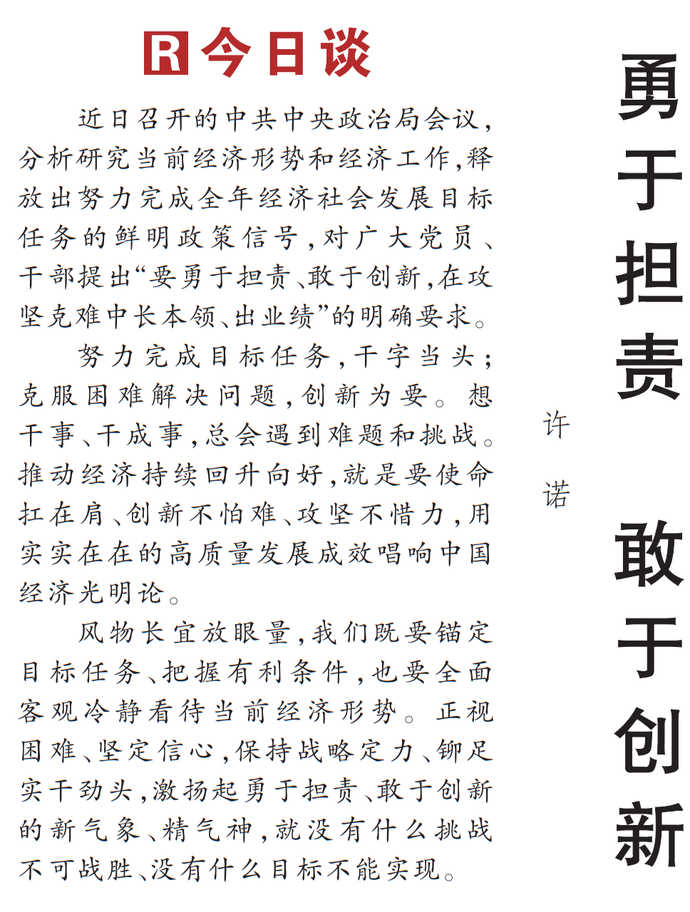 近日召开的中共中央政治局会议,分析研究当前经济形势和经济工作,释放出努力完成全年经济社会发展目标任务的鲜明政策信号,对广大党员、干部提出“要勇于担责、敢于创新,在攻坚克难中长本领、出业绩”的明确要求。(今日《人民日报》1版)