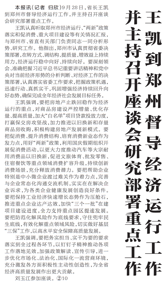 9月28日,省长王凯到郑州市督导经济运行工作,并主持召开座谈会研究部署重点工作。(今日《河南日报》1版)
