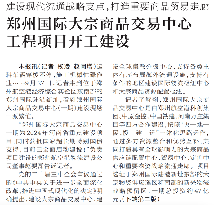 运料车辆穿梭不停,施工机械忙碌作业……9月27日,记者来到位于郑州航空港经济综合实验区东南部的郑州国际陆港新址,看到郑州国际大宗商品交易中心(一期)建设现场一派繁忙。(今日《河南日报》1版、2版)