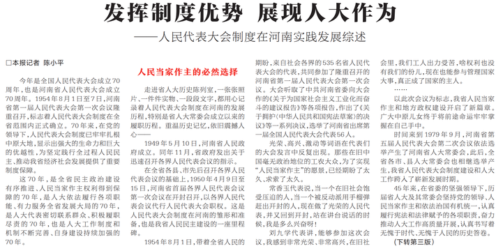 今年是全国人民代表大会成立70周年,也是河南省人民代表大会成立70周年。1954年8月1日至7日,河南省第一届人民代表大会第一次会议隆重召开,标志着人民代表大会制度在全省范围内正式确立。70年来,在党的领导下,人民代表大会制度已牢牢扎根中原大地,显示出强大的生命力和巨大的优越性,为坚定践行全过程人民民主、推动我省经济社会发展提供了重要制度保障。(今日《河南日报》1版、3版)