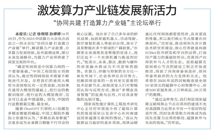 9月28日,作为2024中国算力大会亮点活动之一的主论坛“协同共建 打造算力产业链”举行,解读算力产业政策、分享算力发展经验,发布重磅成果,探讨未来发展路径,为算力产业界搭建了深度交流的平台。(今日《郑州日报》2版)