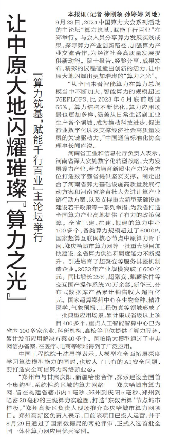 9月28日,2024中国算力大会系列活动的主论坛“算力筑基,赋能千行百业”在郑举行。与会人员分享算力发展实践成果,探寻算力产业创新路径,加强算力产业交流合作,为经济社会高质量发展提供新动能。院士报告、经验分享、成果发布,精彩的议程碰撞出创新的活力,让中原大地闪耀出更加璀璨的“算力之光”。(今日《郑州日报》2版)