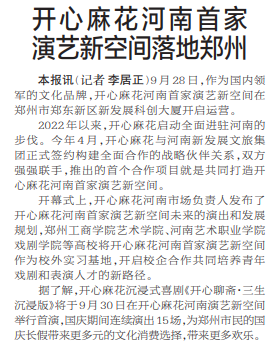 9月28日,作为国内领军的文化品牌,开心麻花河南首家演艺新空间在郑州市郑东新区新发展科创大厦开启运营。(今日《郑州日报》2版)