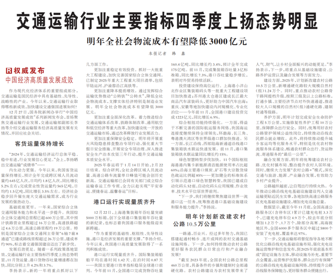 12月27日,国务院新闻办举行“中国经济高质量发展成效”系列新闻发布会,首场聚焦交通运输行业发展,交通运输部副部长李扬等介绍交通运输服务经济高质量发展有关情况,并回应社会关切。(今日《人民日报》2版)