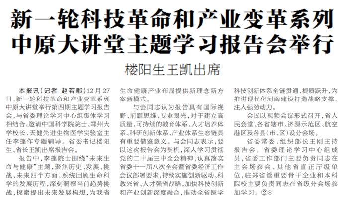 12月27日,新一轮科技革命和产业变革系列中原大讲堂举行第四期主题学习报告会,与省委理论学习中心组集体学习相结合,邀请中国科学院院士、郑州大学校长、天健先进生物医学实验室主任李蓬作专题辅导。省委书记楼阳生、省长王凯出席报告会。(今日《河南日报》1版)