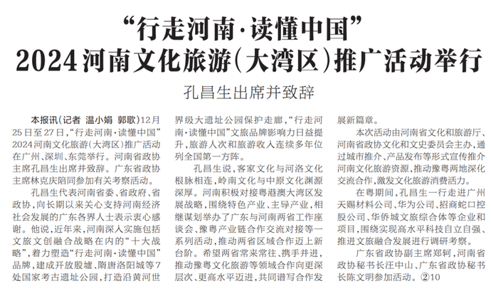 12月25日至27日,“行走河南·读懂中国”2024河南文化旅游(大湾区)推广活动在广州、深圳、东莞举行。河南省政协主席孔昌生出席并致辞。广东省政协主席林克庆陪同参加有关考察活动。(今日《河南日报》1版)