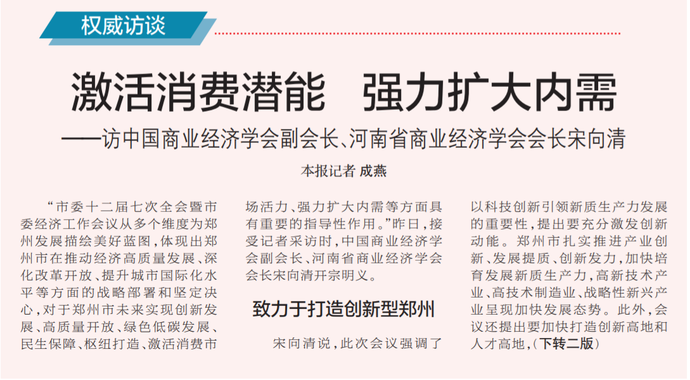 “市委十二届七次全会暨市委经济工作会议从多个维度为郑州发展描绘美好蓝图,体现出郑州市在推动经济高质量发展、深化改革开放、提升城市国际化水平等方面的战略部署和坚定决心,对于郑州市未来实现创新发展、高质量开放、绿色低碳发展、民生保障、枢纽打造、激活消费市场活力、强力扩大内需等方面具有重要的指导性作用。”昨日,接受记者采访时,中国商业经济学会副会长、河南省商业经济学会会长宋向清开宗明义。(今日《郑州日报》1版、2版)
