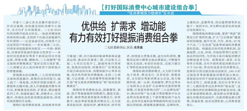 市委十二届七次全会暨市委经济工作会议强调,加快建设国际消费中心城市,全方位扩大有效需求。二七区2024年的消费市场亮点纷呈,一批新消费场景持续亮相出圈,全国首个沉浸式新能源汽车科普馆——比亚迪迪空间,河南首个正式双首层户外街区——杉杉奥莱二七店,河南省省级旅游休闲街区——中铁·泰和里,河南省首批城市更新示范项目——米房时尚创意街区等多个新商业项目开放运营,贾鲁水镇、樱桃沟、二七商圈等“商文旅体消费集聚区”更好实现引流扩源,二七商圈正式入选河南省首个国家级示范智慧商圈。(今日《郑州日报》2版)