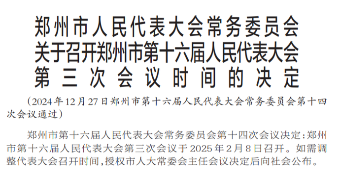 郑州市第十六届人民代表大会常务委员会第十四次会议决定:郑州市第十六届人民代表大会第三次会议于2025年2月8日召开。如需调整代表大会召开时间,授权市人大常委会主任会议决定后向社会公布。(今日《郑州日报》3版)