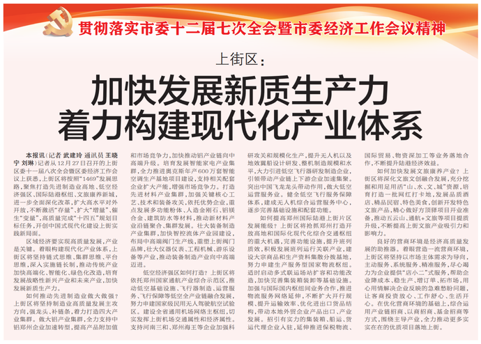 记者从12月27日召开的上街区委十一届八次全会暨区委经济工作会议上获悉,上街区将按照“1469”发展思路,聚焦打造先进制造业高地、低空经济强区、国际陆港枢纽、文旅康养新城,进一步全面深化改革,扩大高水平对外开放,不断激活“存量”、扩大“增量”、催生“变量”,高质量完成“十四五”规划目标任务,开创中国式现代化建设上街实践新局面。(今日《郑州日报》3版)