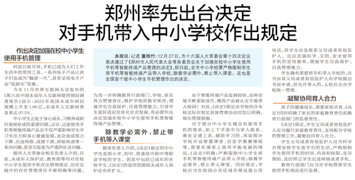 12月27日,市十六届人大常委会第十四次会议表决通过了《郑州市人民代表大会常务委员会关于加强在校中小学生使用手机等智能终端产品管理的决定》,即日起,全市中小学校要严格限制学生将手机等智能终端产品带入学校,除教学必需外,禁止带入课堂。这也是全国首个就中小学生手机管理作出的决定。(今日《郑州日报》3版)