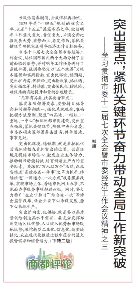 2025年是“十四五”规划的收官之年,也是“十五五”谋篇布局之年,做好明年工作意义重大、责任重大,必须全面把握发展大势,乘势而上、奋发作为,紧抓关键环节确保完成明年经济工作目标任务。(今日《郑州日报》1版)