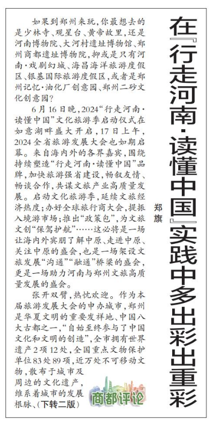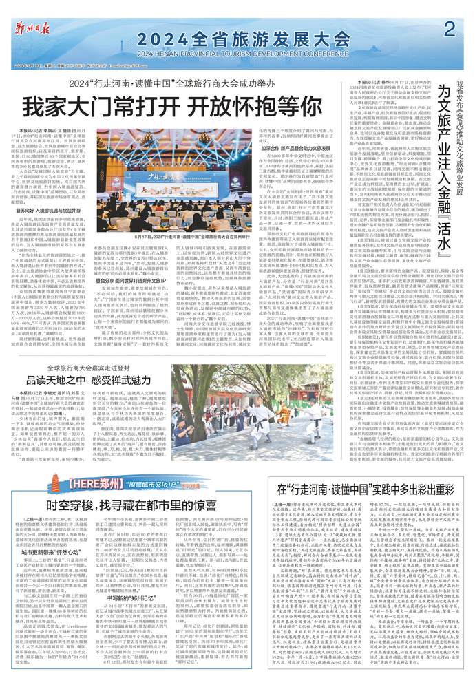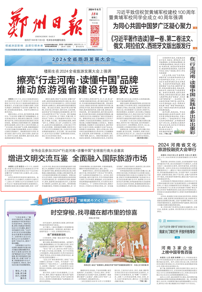 6月17日,2024全省旅游发展大会在郑州召开,深入学习贯彻习近平文化思想和习近平总书记关于旅游发展的重要论述重要指示,在实施文旅文创融合战略上再深化再提升,持续塑造“行走河南·读懂中国”品牌,加快建设旅游强省。省委书记楼阳生出席并讲话。(今日《河南日报》1版)