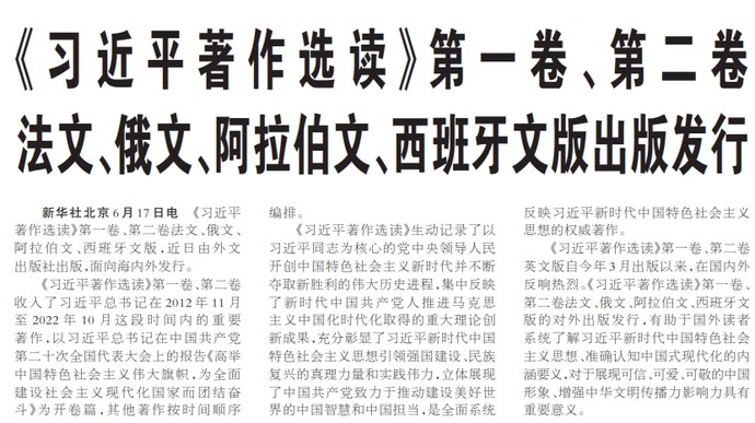 《习近平著作选读》第一卷、第二卷法文、俄文、阿拉伯文、西班牙文版,近日由外文出版社出版,面向海内外发行。(今日《人民日报》1版)