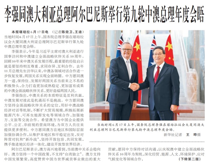 当地时间6月17日上午,国务院总理李强在堪培拉议会大厦同澳大利亚总理阿尔巴尼斯举行第九轮中澳总理年度会晤。(今日《人民日报》1版、2版)