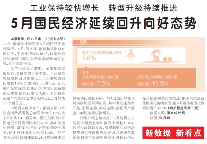 17日,国家统计局发布5月国民经济运行情况。5月,服务业、消费和进出口有所回升,工业保持较快增长,转型升级持续推进,国民经济延续回升向好态势,运行总体平稳。(今日《人民日报》1版、3版)